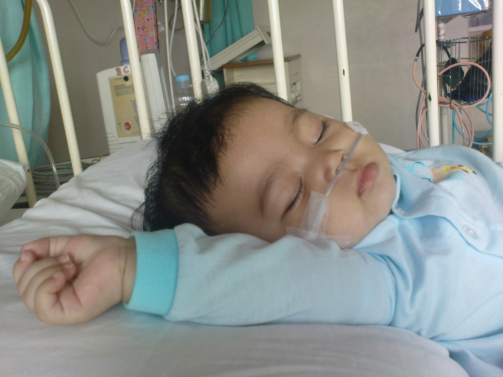 Mula-mula ingatkan demam biasa..bawak klinik..dah masuk 3 hari tak jugak sembuh-sembuh..mak aku dah mula bising..risau tengok cucu dia dah lembik..nak tak nak bawak gak ke hospital..time tu memang tengah hangat kes H1N1..risau gak..tapi suhu badan dia time tu turun disebabkan aku balut dia ngan tuala basah on way ke spital...so doktor kata demam biasa..aku tak puas hati..sebab aku kata dah 4 hari demam dia tak kurang..makin panas..adakala suhu badan dia sampai 40c..panas tu..tapi doktor kata.."u kasi dia makan ubat ikut aturan..kalau lagi 3 hari dia tak kurang bawak balik hospital.."